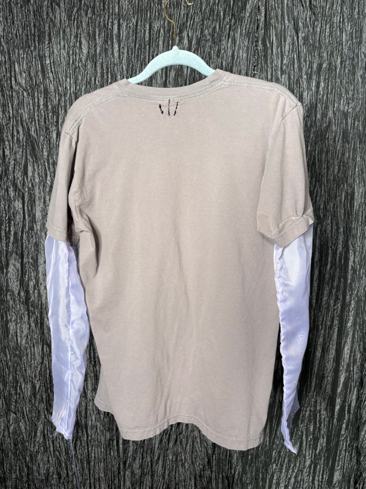 Made from found secondhand T-shirt, and up cycled with Lactose original illustrative patch, and sheer sleeves.